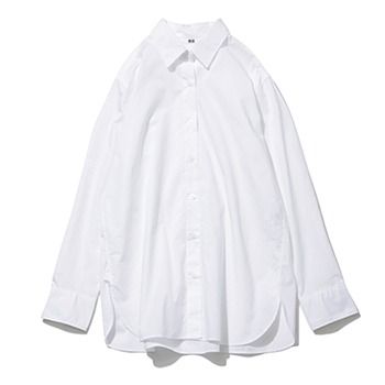 白シャツ 2,990円/UNIQLO 「えりの大きさや、すそに向けて若干広がりを持たせた形で、着こなしやすいプレーンな白シャツ。ポイントはサイズ感で、3XLなど大きめなものを選びます。肌感のあるインナーにばさっと羽織りものとして合わせるのにも重宝」(船戸さん)