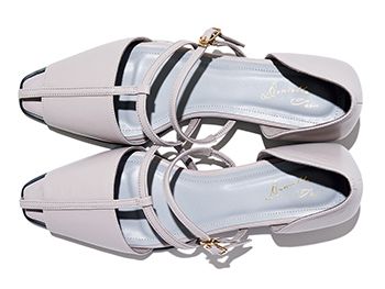 甲浅パンプスは肌が広く出るからのっぺりしがち。甲ストラップつきなら、肌感を分断できて間のびをおさえつつ、ホールド力も高めるなどいいことずくめ。