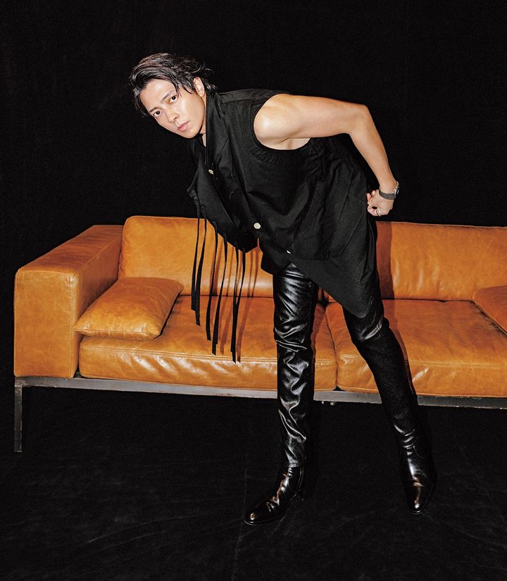 トップス・レザーパンツ・ブーツ(すべてスタイリスト私物)腕時計「オクト フィニッシモ クロノグラフ GMT」¥2,827,000(チタン)リング「セルペンティ ヴァイパー」¥331,100(ホワイトゴールド)(ともにブルガリ ジャパン)