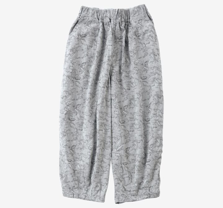 日常に寄り添いながら、さりげなく個性を演出してくれる服が揃う〈ハーベスティ〉。丸みを帯びた立体的なボリュームが印象的な「サーカスパンツ」は、ブランドの代表的アイテムのひとつ。ペイズリー柄のジャカード生地で仕立てられた新作は、適度な落ち感と自然な光沢が持ち味。締め付けのないストレスフリーなはき心地ながらも、カジュアルになりすぎないのがいい。