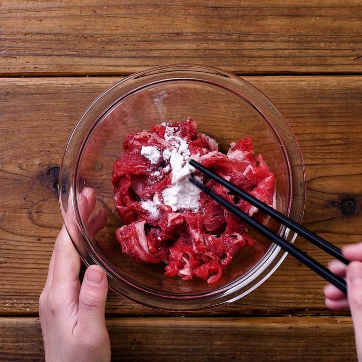 1: 牛肉に酒、塩、片栗粉を入れて混ぜ合わせます。