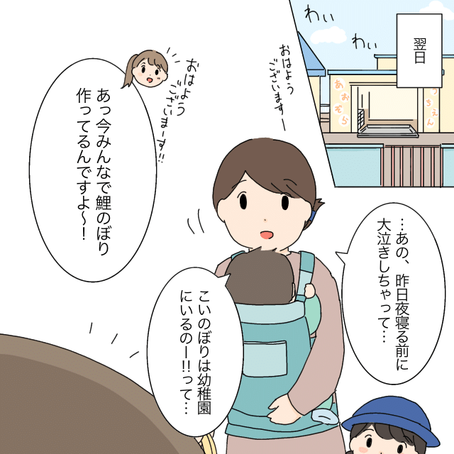 「おはようございます。・・あの、昨日夜寝る前に大泣きしちゃって・・『こいのぼりは幼稚園にいるのー!!』って・・」