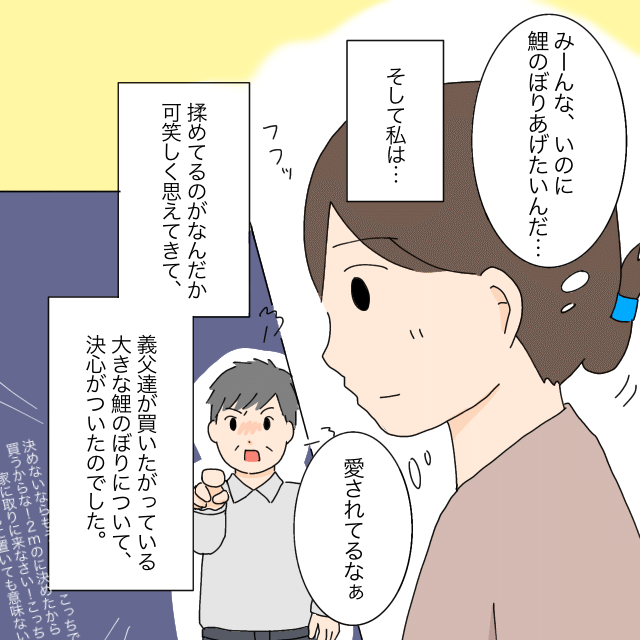 義父達が買いたがっている大きな鯉のぼりについて、ある決心をしたのでした。
