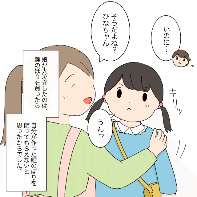 ひなが大泣きしたのは、鯉のぼりのを買ったら、自分が作った鯉のぼりを飾ってもらえないと思ったからでした。