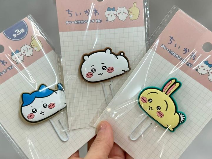 びよーんと寝転ぶハチワレ・ちいかわ・うさぎがそれぞれついた、チャーム付きクリップ。大きめなので、さまざまなものを挟めそうです。