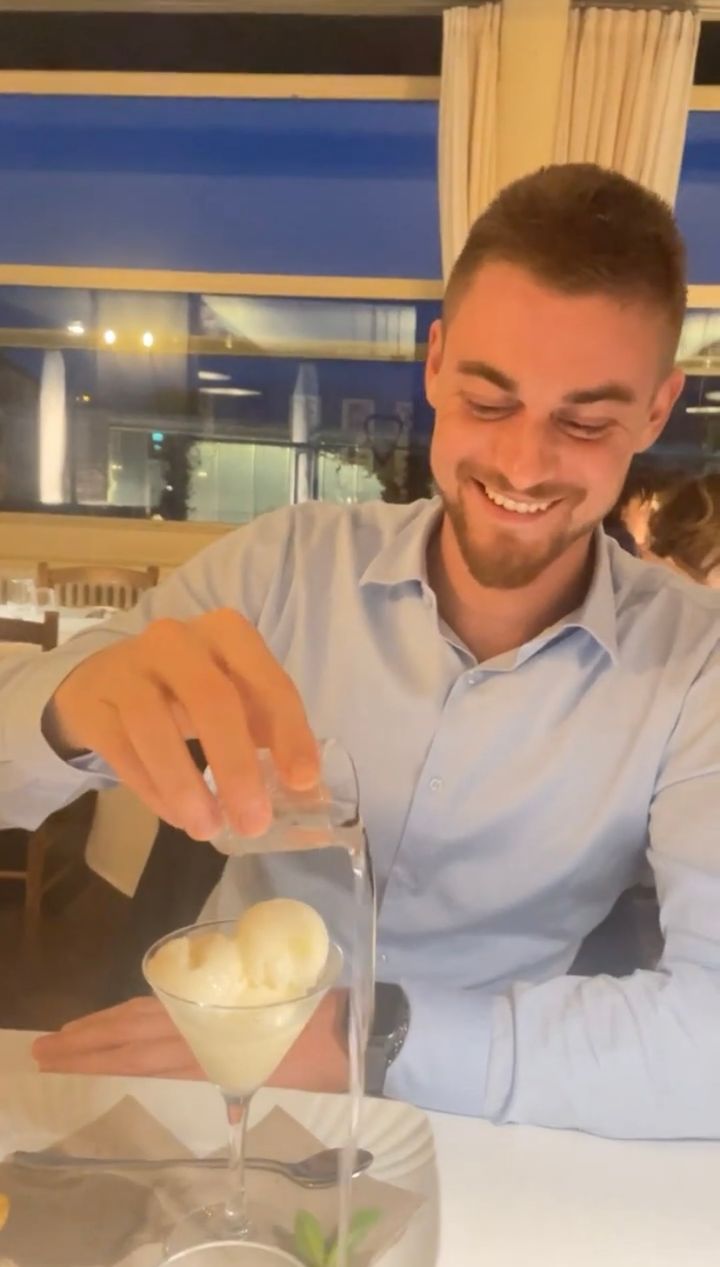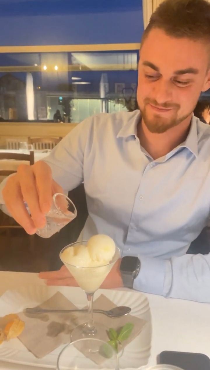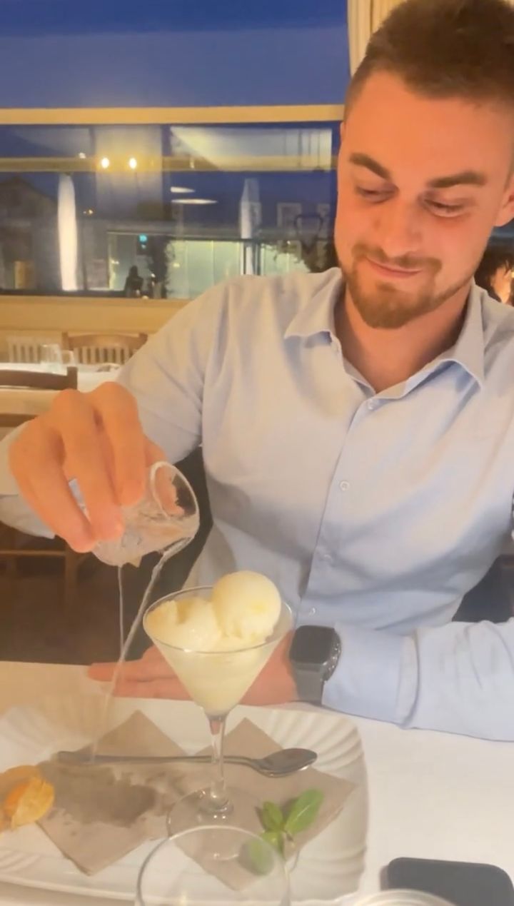 3. 塩梅が難しい・・。デザートのアイスに添えられたリキッドをかけようとした結果・・【海外・動画】