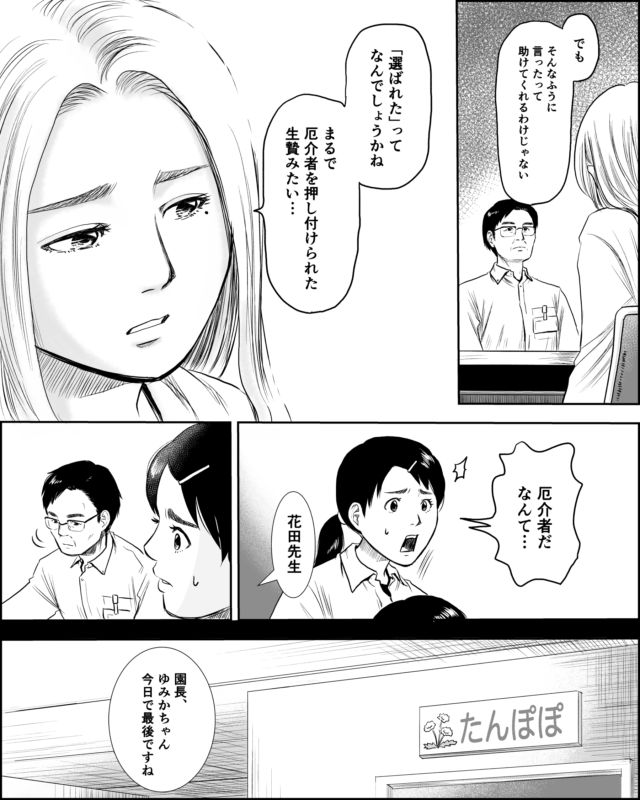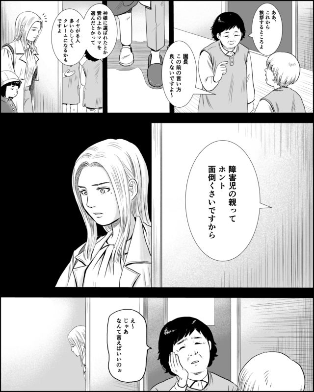 「園長、この前の言い方良くないですよ~。『神様に選ばれた』とか、『雲の上からママを選んだ』って、イヤがる人多いらしくてクレームになるかもですよ・・障害児の親ってホント、面倒くさいですから」
