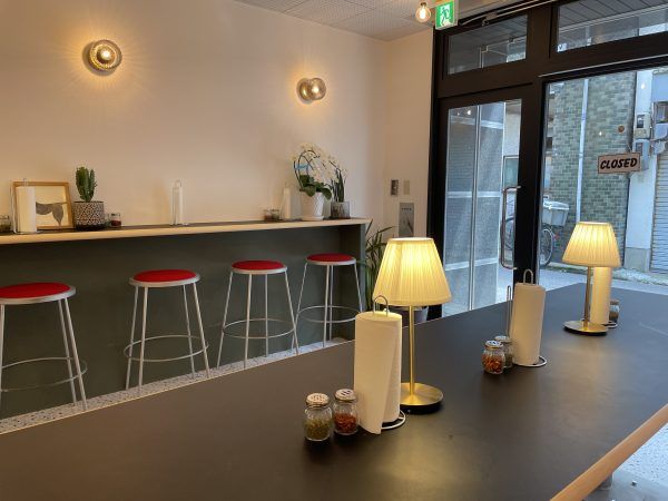 店内はカウンター席、長椅子もあり、さくっとおひとり様も歓迎な雰囲気です。また、大きなスクリーンにはアニメが上映されていて、お子さまも喜びそうです!