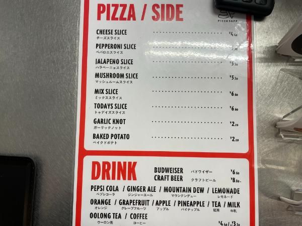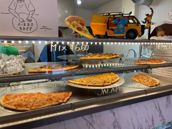 ピザは6種類から選べます。ショーケースの中からどれにしようか迷います♪マッシュルームが食べたい気分でしたので、マッシュルームスライスとレモネードを注文しました。 陳列されているピザをすぐに温めなおして下さいます。