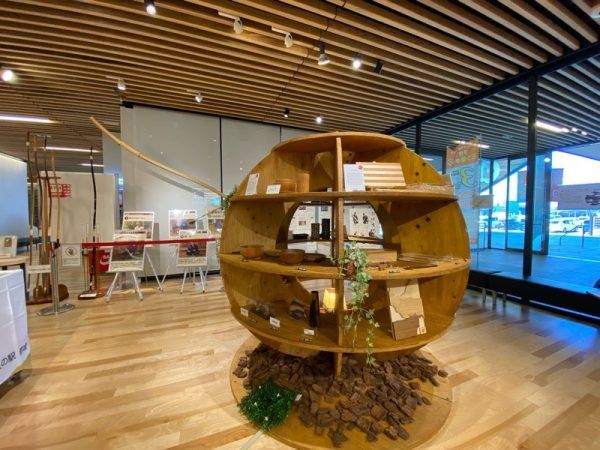 西口から入るとすぐのホールには、「都城大弓」などの地元都城の工芸品が並べられていました。