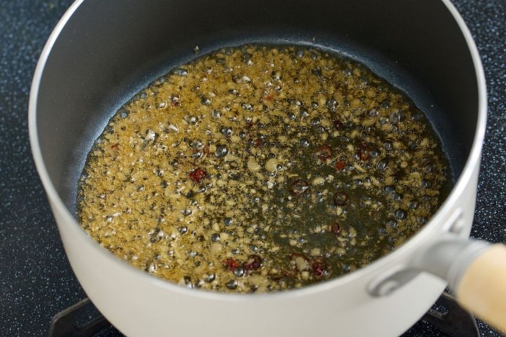 たっぷりのごま油を使ってしょうが、にんにく、唐辛子などを炒めたら、にらにそのままかけて香りを引き出します。