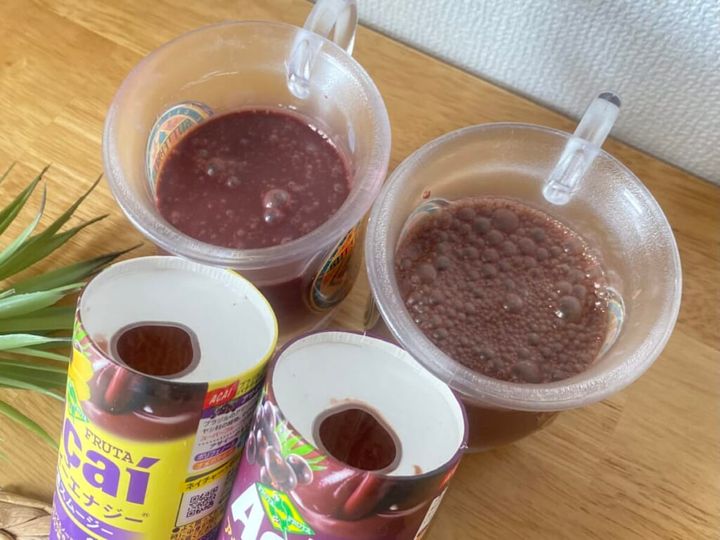フタをあけてコップに注いでみると、「アサイーエナジー」は濃い紫色。「アサイーベーシック」は、紫と茶色が混ざったような色合いで、絶妙に色が違うのがわかります。