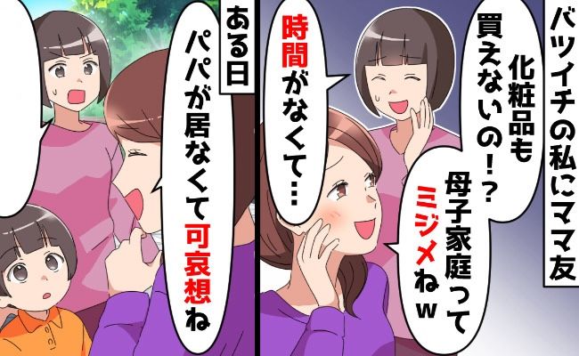 「貧乏人は化粧品も買えないのね〜」シンママの私を見下すママ友→娘までバカにするので反撃した結果…
