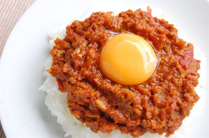 7. ご飯(分量外)の上に6をかけ、卵黄をトッピングして出来上がり。