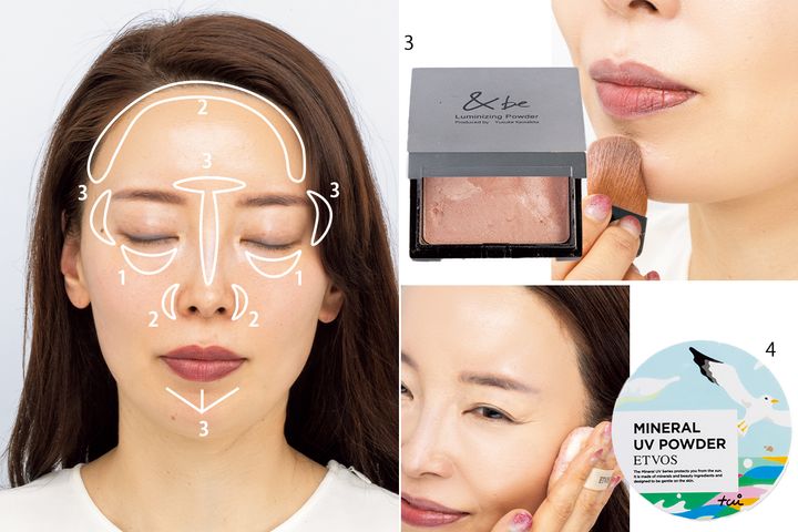 Tゾーン、Cゾーン、あご先にはハイライトの&be ルミナイジングパウダーで光を集めて、透明感のあるメリハリ顔に。
