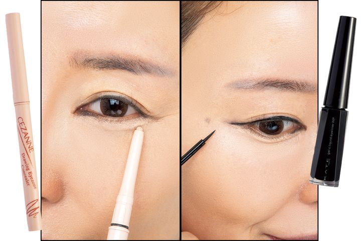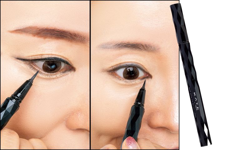 離れ目解決の一番の技はアイラインを目頭にくの字に入れること。ケイトのスーパーシャープライナーが描きやすい。少ない下まつ毛は描き足して目を大きく見せます。