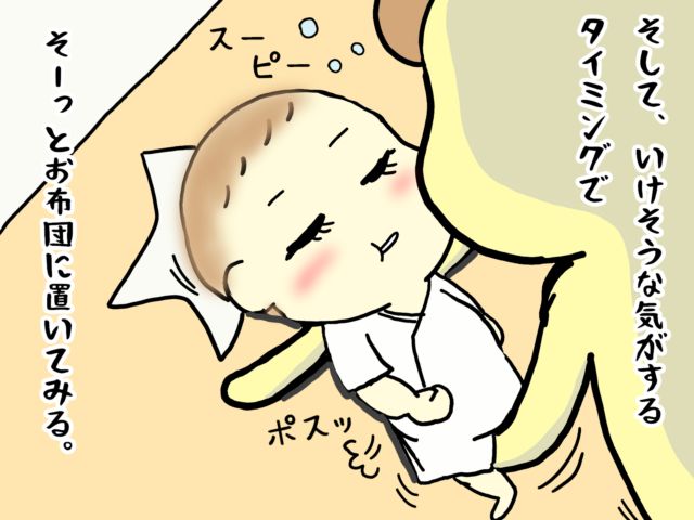 そして、いけそうな気がするタイミングでそーっとお布団に置いてみる。
