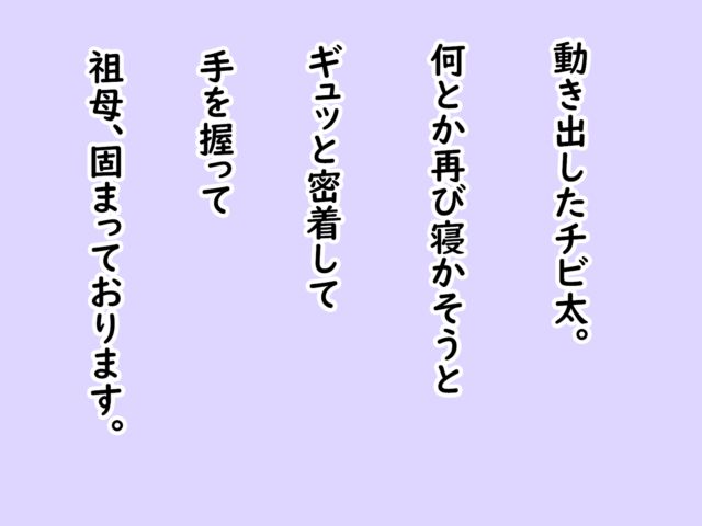 腕の中で眠りについたチビ太くんの熟睡を確認し、静かに布団に移動するてる子さん。姿勢を崩さずスクワットのようにしゃがみ、しばらくジッと我慢。そして、そーっとチビ太くんを布団におろすと・・・ピクッとチビ太くんの手が動きます。チビ太くんが起きる気配を感じて焦ったてる子さんは、すかさず身体を密着させ、手を握り、「あなたは包まれている感」を演出。起こしてなるものかと必死なてる子さんです。