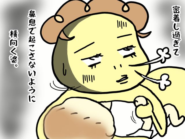 密着しすぎて鼻息で起こさないように横を向いて呼吸する婆。