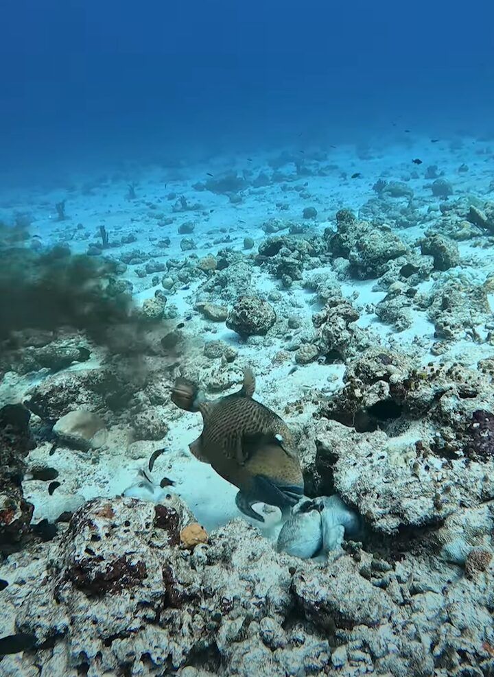 サンゴをも砕く強力なあごの力を有するというゴマモンガラに狙われたタコでしたが、今回は危機一髪、幸運にも逃れることができたみたいです。