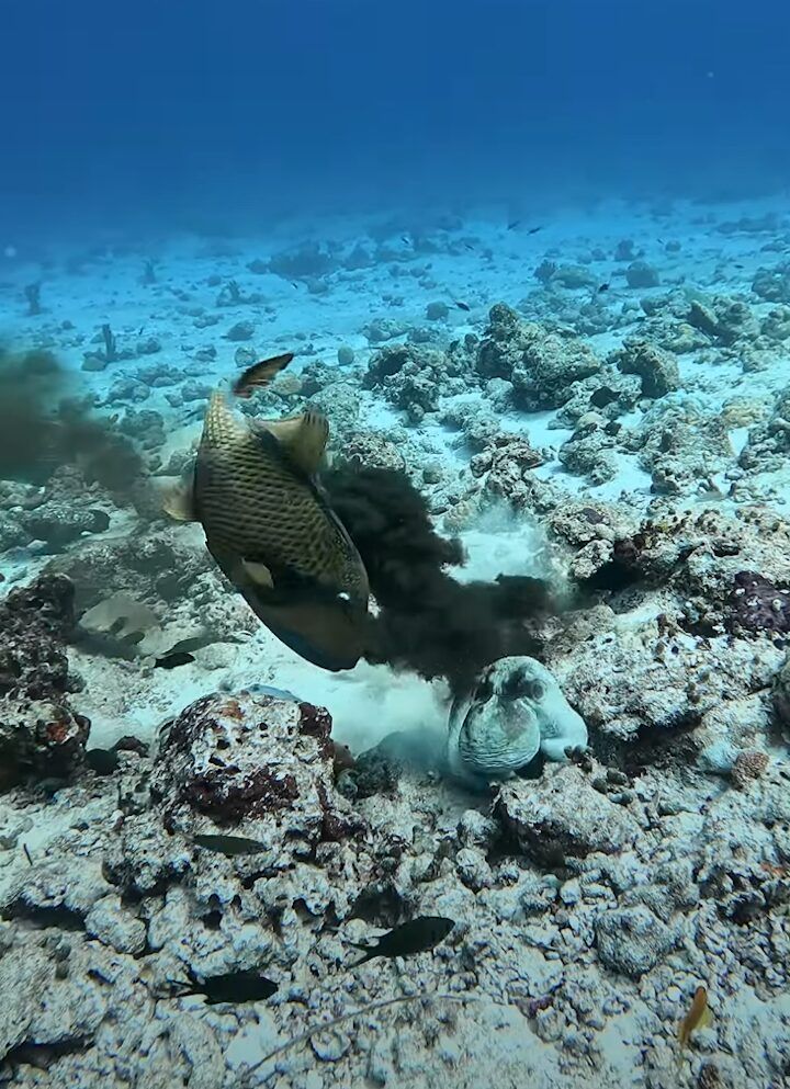 タコVSゴマモンガラ!?タコスミにたじろがない魚・・その白熱の戦いの行方は【海外・動画】
