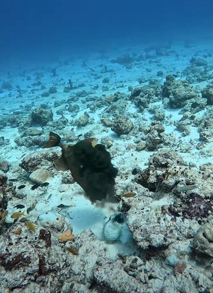 そんなヴァーブ環礁でダイバーが出会ったのは、ゴマモンガラというカワハギの仲間。 このゴマモンガラは、なにかを狙っているようですが・・・