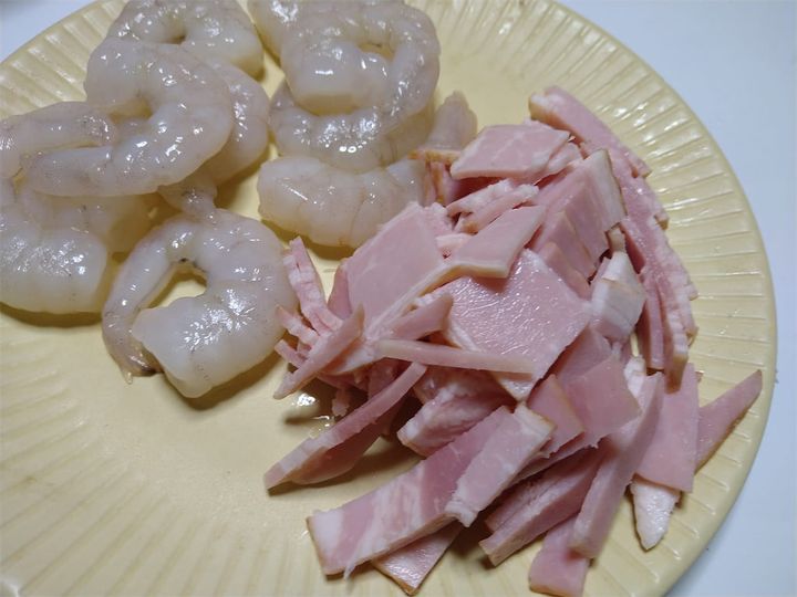2.ベーコンは2cm幅程度に切ります。小ぶりなむきエビはそのまま使用してOKですが、大きいものは食べやすい大きさに切っておいてください。