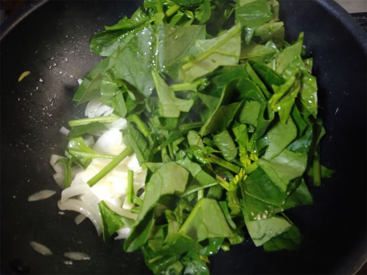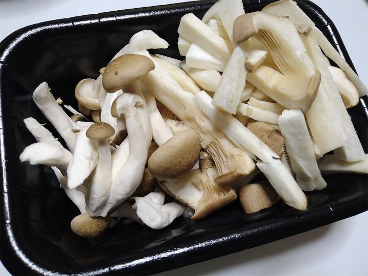 1.ほうれん草を5cm程度にカットして、玉ねぎは薄切りにします。しめじは軸を落として小分けにし、エリンギは軸を落として薄切りにします。