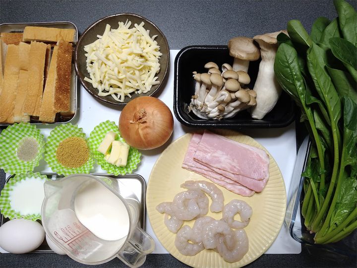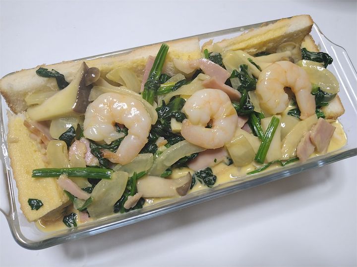 一口食べると、パンの耳のモチモチ食感がとってもボリューミー!パイ生地のサクサク感はありませんが、バターで炒めたほうれん草ときのこが生クリームのコクと合わさり、その旨味をパンの耳がすべて吸収しているので、噛むごとに旨味とコクが口の中に溢れます♡たくさん入れたエビもプリっプリで食べていて楽しいです♪
