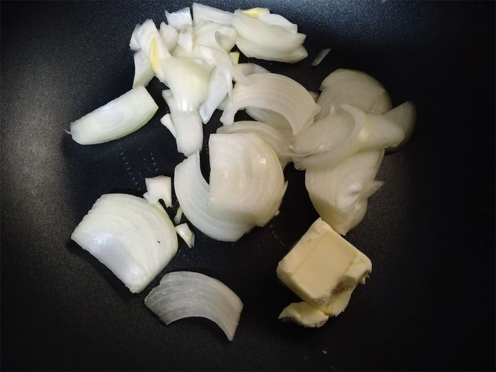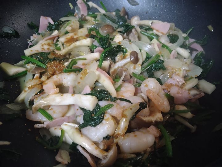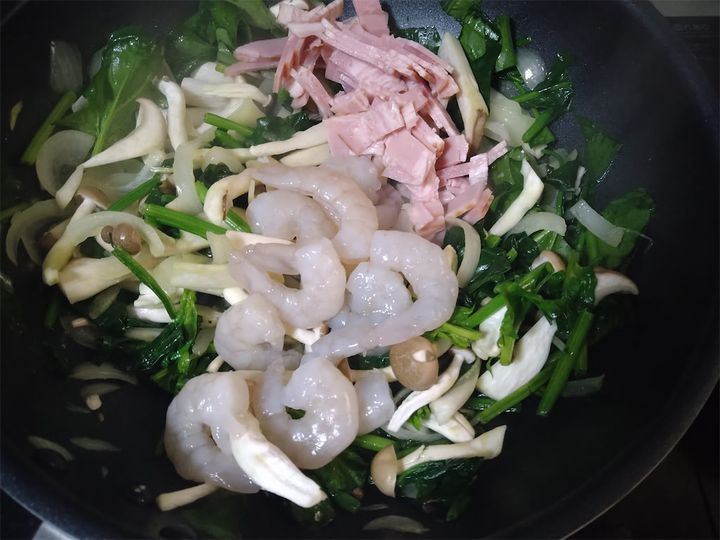 3.フライパンにバター20gを熱し、玉ねぎがしんなりするまで炒めたら、ほうれん草、エリンギ、しめじ、ベーコン、エビを順に入れて炒めます。