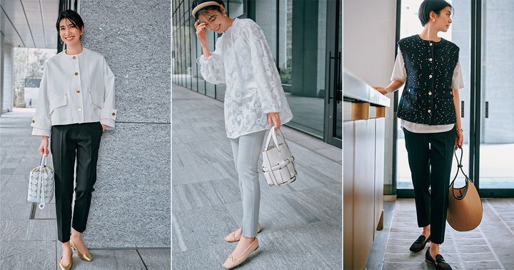 ツイードのリッチな素材感をジレで軽快に取り入れて。インナーには白を入れて爽やかさも忘れずに。