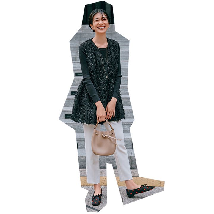 黒パンツ¥12,100(グリーンレーベル リラクシング/ユナイテッドアローズ グリーンレーベル リラクシング ルミネ有楽町店)ロンT¥19,800(プルミエ アロンディスモン)ジレ¥61,600(ニアー ニッポン/ニアー)バッグ¥40,700(ヴァジック/ヴァジックジャパン)パンプス¥59,400(ネブローニ)ネックレス¥20,900(ジュエッテ)