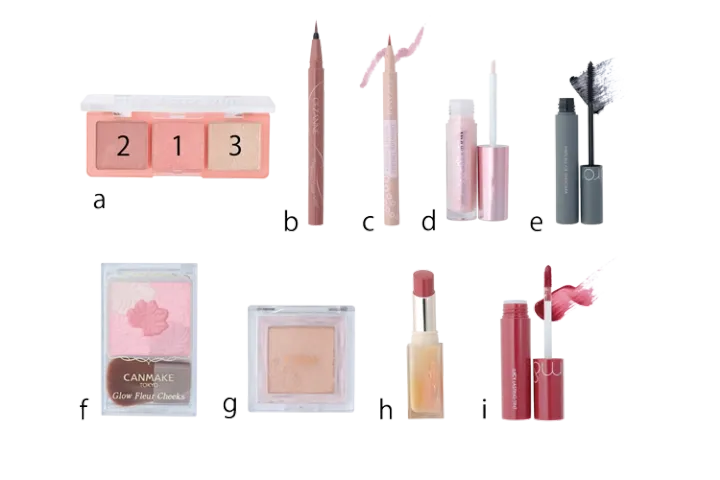 a-1を上下まぶた全体に、a-2を目尻1/3側にくの字にa-3を目頭にオン。bで目尻に太めのハネ上げラインを、cで基本の下まぶたラインを引く。dを涙袋全体にのせ、上下まつ毛にeを塗る。