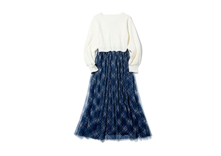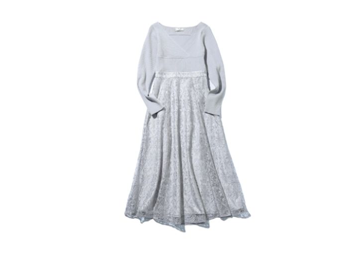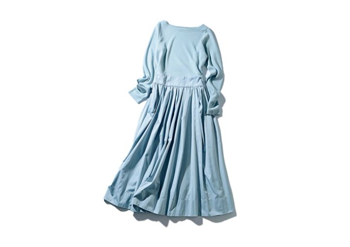 ボートネックのニットと布帛のギャザースカートがドッキング。今年買い足すならペールブルーがイチオシ!ドッキングワンピ¥22,000/ルーニィ