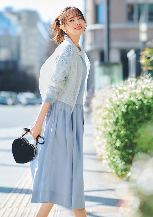 ほのかに透けるワンピの軽やかさが春にぴったり。