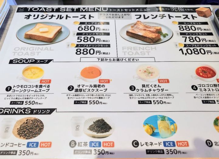 「究極」食パンを使ったトーストやフレンチトースト、スープ、ドリンクも用意し(セット・単品あり)、テラス席でもいただけます。