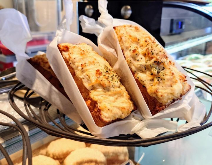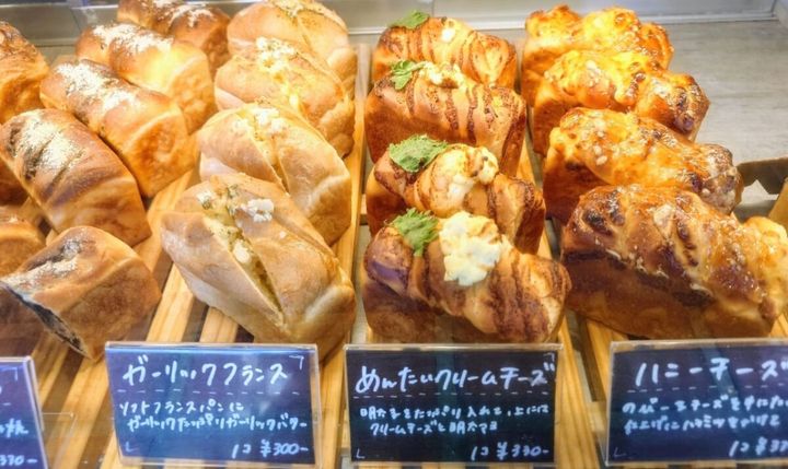 (左から)「ガーリックフランス」、明太子をたっぷり入れた「めんたいクリームチーズ」、本郷ベーカリーでも人気の「ハニーチーズ」。