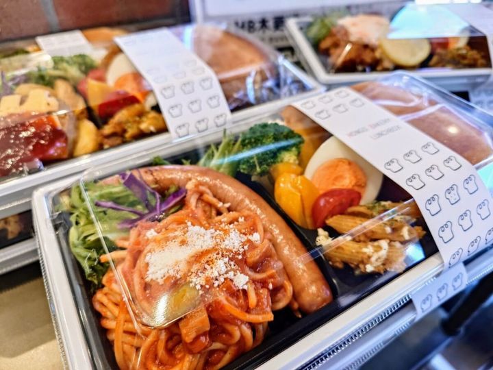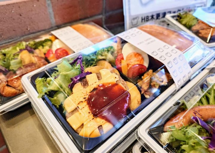 木更津店限定「ランチボックス」(税込850円)。選べるメインのお惣菜・カラフルなサラダ・プレーンの手のひら食パンがセットになったお弁当。内容は日によりますが、この日のメインは「からあげ・ナポリタン・チーズハンバーグ・チキングリルステーキ」の4種類でした。