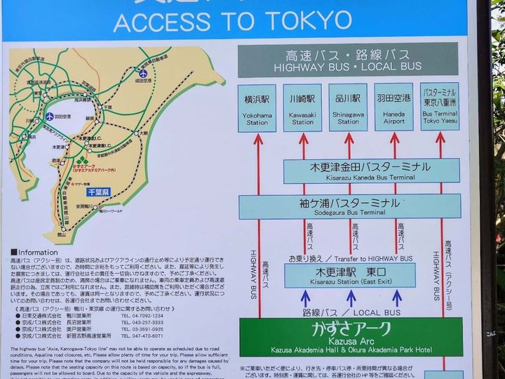 交通:高速バス「バスターミナル東京八重洲」乗車(乗車時間65~100分)「かずさアーク」下車徒歩約5分、「木更津駅」から路線バスで約22分