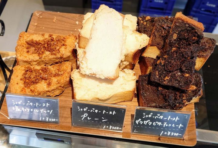 分厚くカットした「究極」の食パンに砂糖とトッピングを目いっぱいのせた「シュガーバタートースト」(税込300円~330円)も魅惑的な人気メニューです。