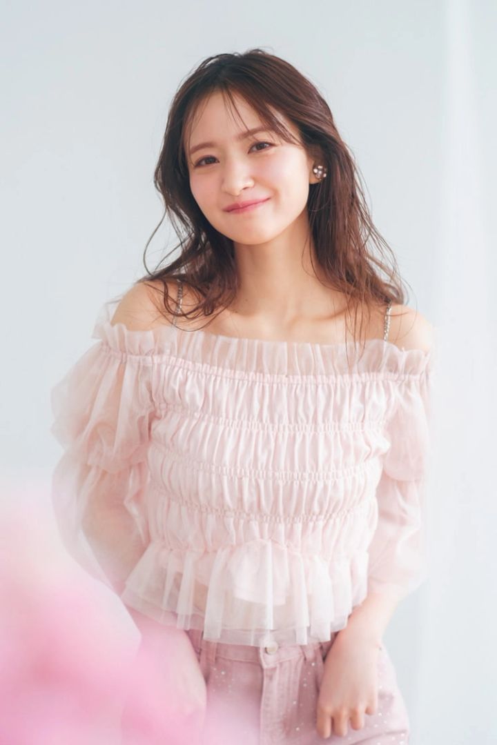 大胆なオフショルも、シャーリングのボリュームで肌見せ具合を調節。淡いピンクでギャルっぽさを回避。