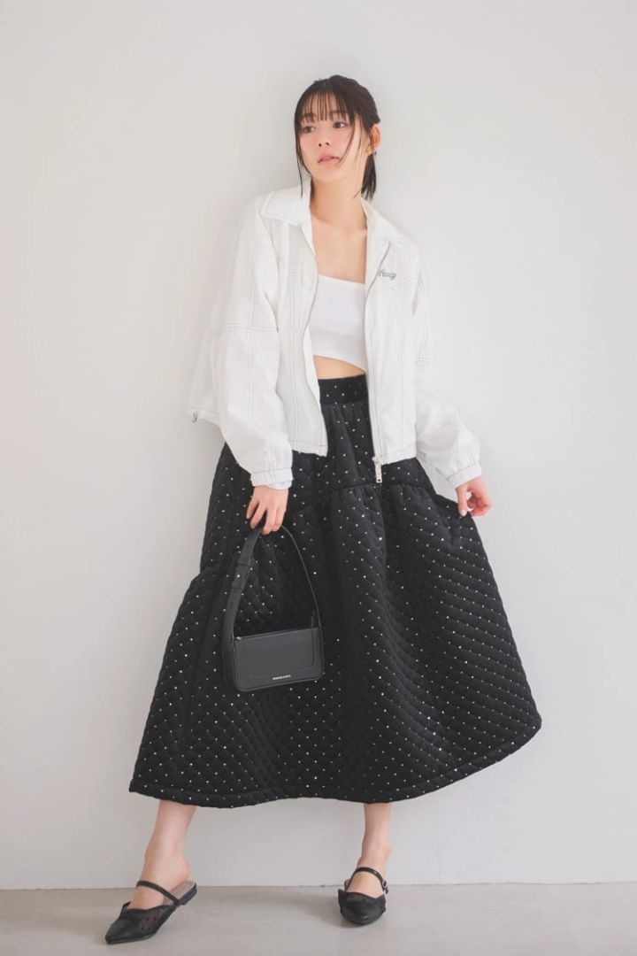 黒ビジューキルティングスカート 3,990円、ミュール 3,390円/ともに神戸レタス 白ナイロンジャケット 11,954円/ナスティーファンシークラブ(スクリーンショット) イヤリング 1,540円/アネモネ(サンポークリエイト) バッグ 9,900円/チャールズ&キース(チャールズ&キース ジャパン) インナー/スタイリスト私物