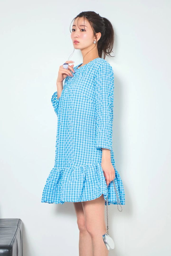 ブルーチェックワンピース 97,900円/エーヴィーエヌ(コロネット) イヤリング 5,250円、リング 8,640円/ともにアビステ バッグ 3,289円/ROPÉ PICNIC PASSAGE(ジュン)