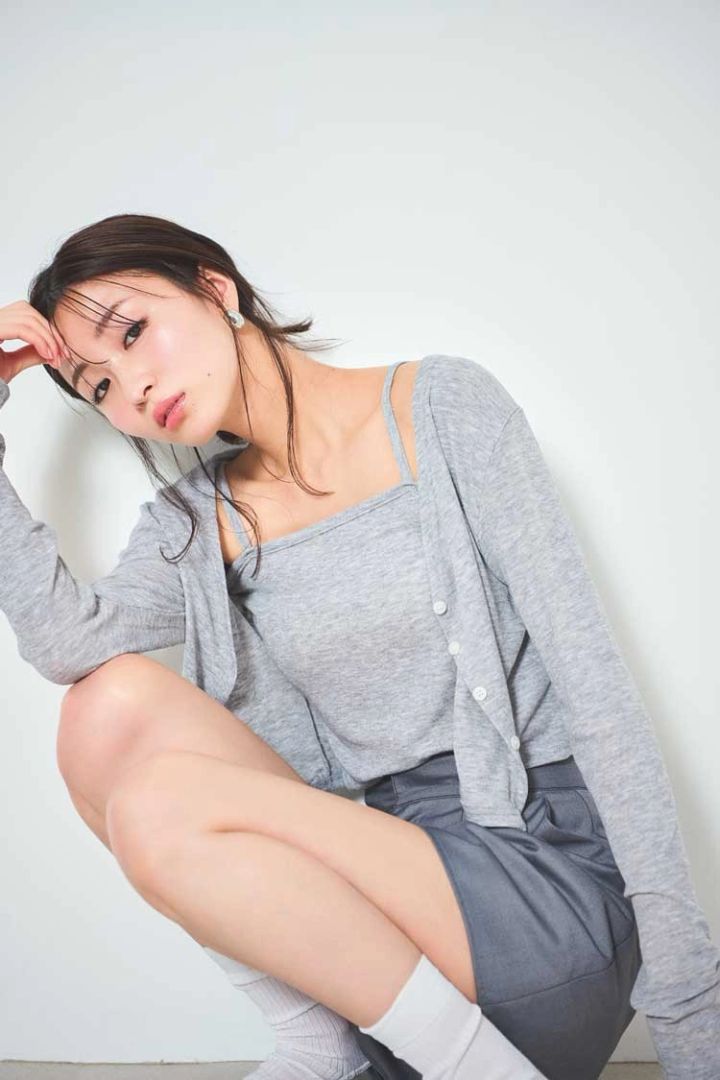 グレーショートパンツ 8,800円/rienda(バロックジャパンリミテッド) グレーキャミとカーディガンのセット 3,849円/PHILLY イヤリング 5,670円/アビステ ソックス/スタイリスト私物
