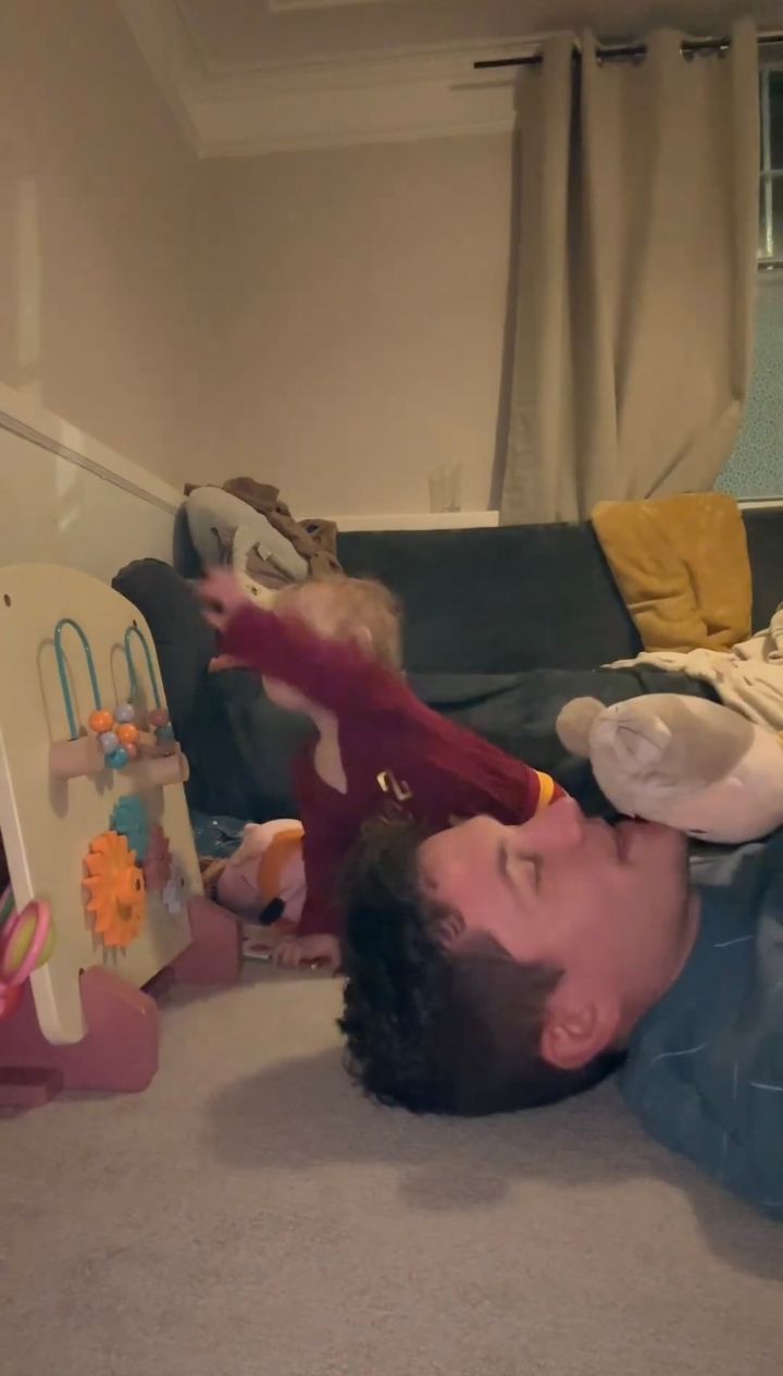 寝転んでいるパパに向かって勢いよく倒したのです!