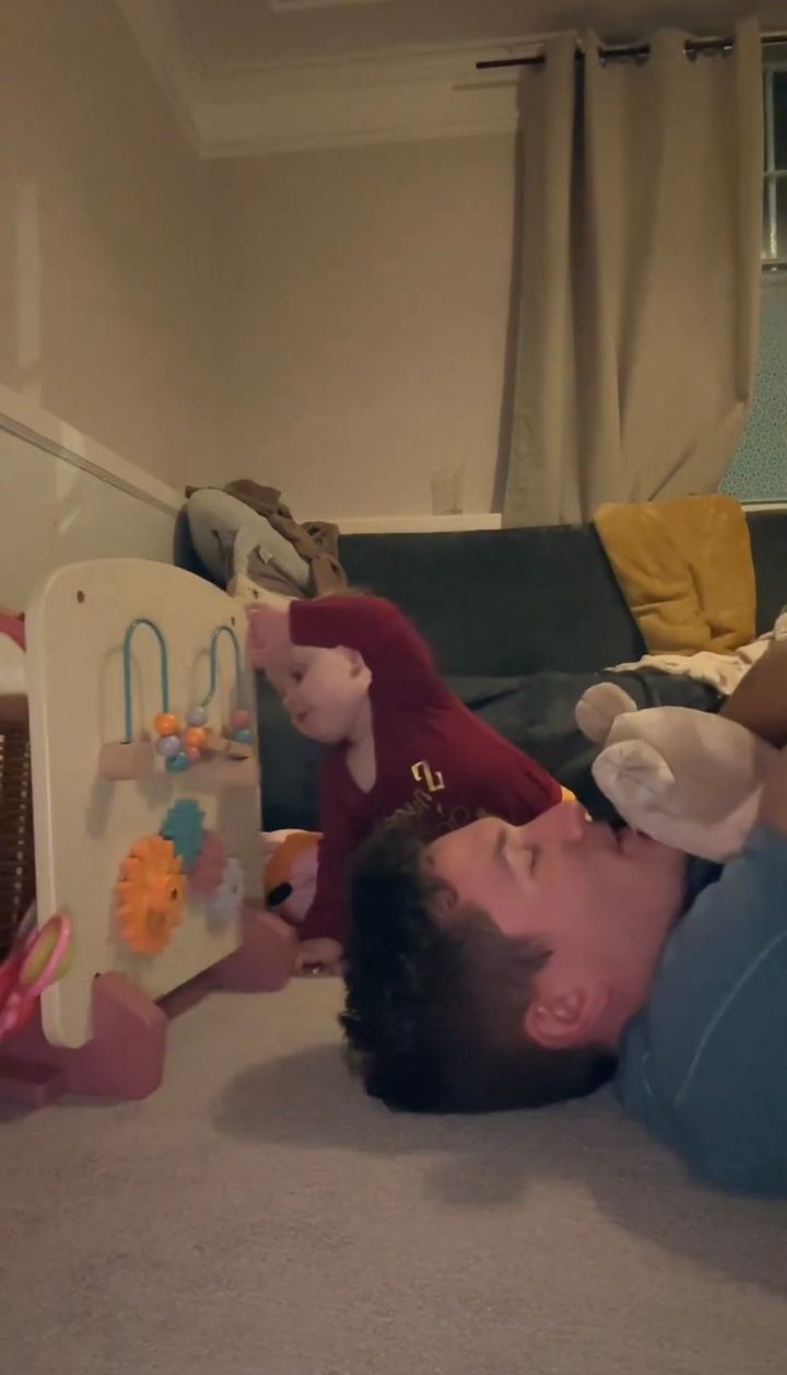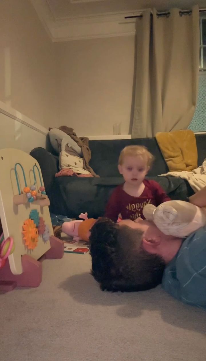 そこには床に寝転んでお人形で遊ぶパパと、そんなパパをジーッと見つめる女の子の姿がありました。