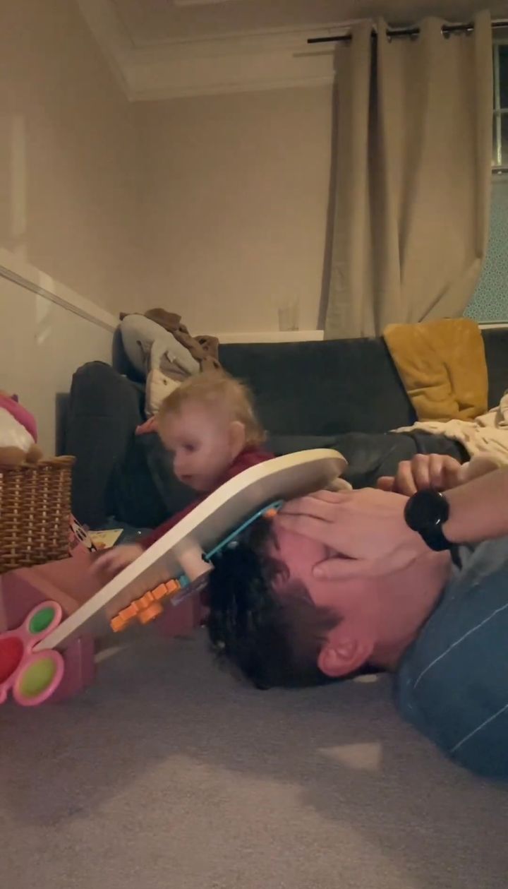 倒れたオモチャは、パパの頭に直撃・・・!! お人形で遊んでいる最中に襲ってきた突然の痛みに、パパは思わず声をもらします。