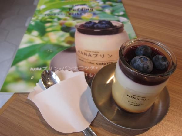 HANAプリン+パンナコッタ。季節のプリンで、濃厚美味しい卵を使ったプリンとパンナコッタが2層になっていて、ブルーベリーソースとフレッシュブルーベリーがのってました。