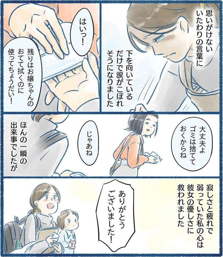 そのような時に当たり前のように救いの手を差し伸べてくれて、ママをねぎらう言葉までかけてくれる人がいるだけで気持ちが一気にリセットされるように感じるのではないでしょうか。