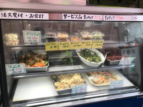 おから・きんぴらごぼう・筑前煮・新じゃがみそ炒めなど、様々なお惣菜が1パック150円から売られていました。